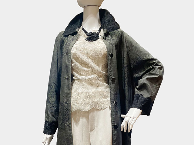 - 着物の反物から製作したコートになります。深緑の着物の柄を活かしながら、襟と袖にレースを付けることで上品なデザインに仕上げました。