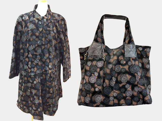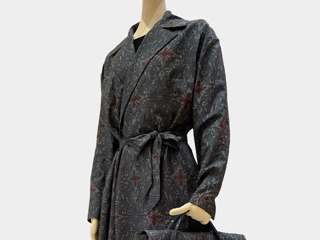 - 大島紬を解いて、コートへ仕立て直しました。着物1着分でコートとカバンを製作しております。