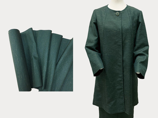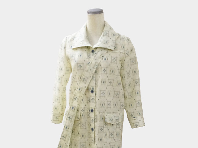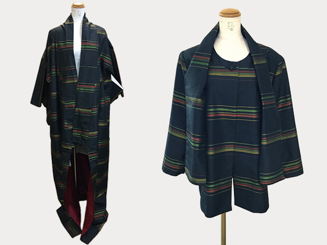 - 男性用着物の反物から、コートとスカートをセットで製作しました。男性用の反物の柄や色味は少し地味ではありますが、幅広くどんなものにでも合わせられる洋服になっております。