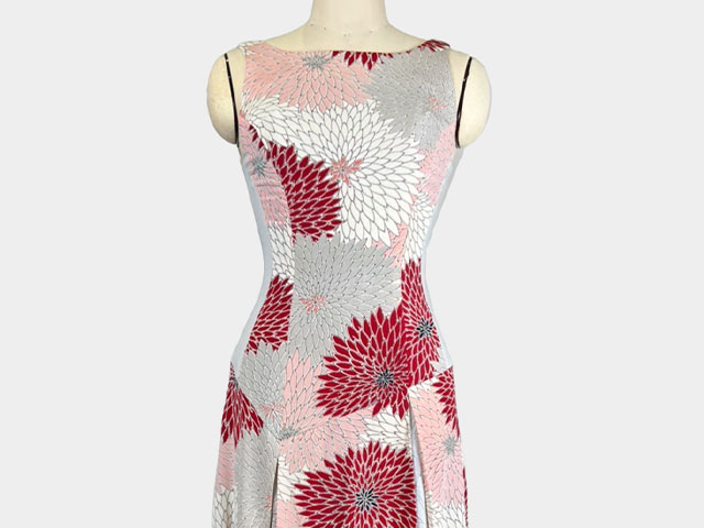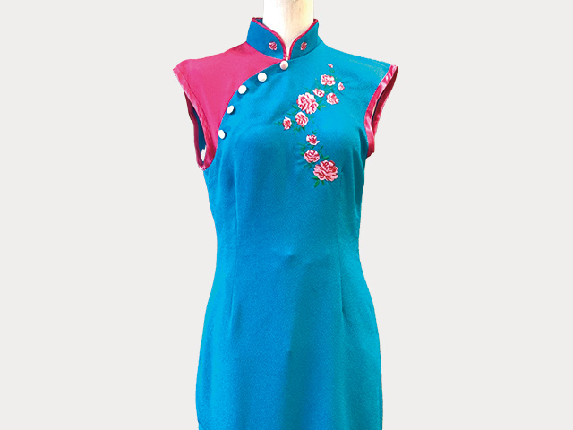 - アオザイに合うように、刺繍機で花を入れました。刺繍はラメ糸や複数の色を使用することにより、立体感が出るようにしています。また、バイアスや切り替え部分に刺繍に合うピンクを使い、アクセントを付けています。