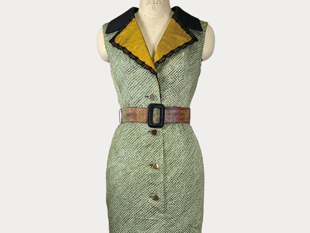 - 総絞り羽織をタイトなワンピースにしました。グリーンの質感がとても良い羽織をとてもロマンティックなワンピースにしております。洋装の飾りを取り入れてボタンやベルトにもこだわりと個性をいっぱい入れました。