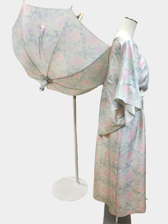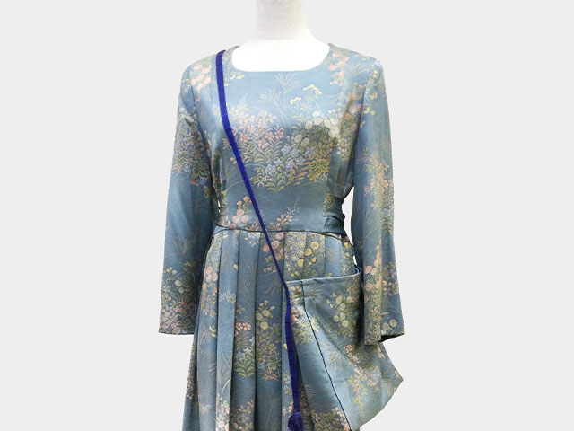 - 三川店では、普段使いの出来る着物リフォームの一着を提案します。着物地一反から洋服だけでは残布が勿体ないので、お揃いの傘、斜め掛けバッグ、エコバッグなど余すことなく製作しました。