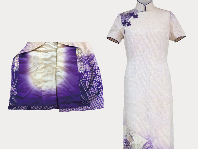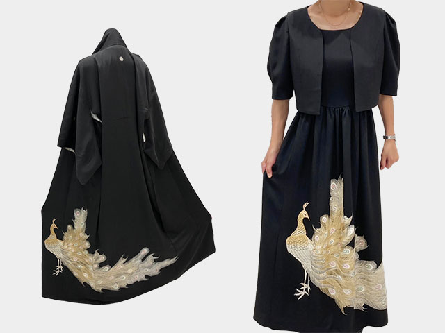 - 結婚式では、必須の留袖をとても着やすくオシャレなドレスに仕立て直してみました。洋装のドレスには無い和装の大胆で豪華な柄を更に素敵に作り替えております。お袖もシースルーで、エレガントさをだしました。