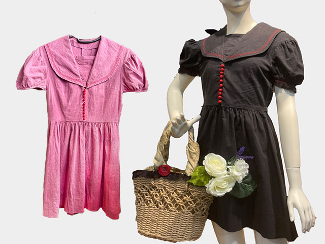 - ネットで見かけたスカートを着物で再現。プリーツスカートの部分はリサイクルショップのものを使用し、ブラウスはほどいた着物の裏地を染色し製作しました。物を捨てないリユースの時代へ、いざ。