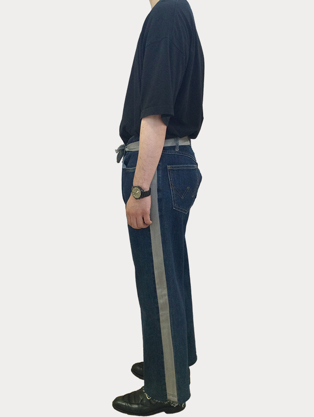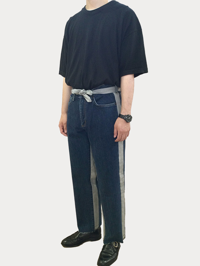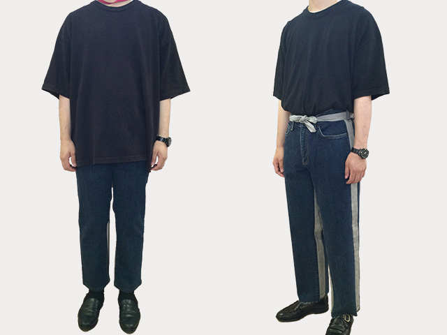 - 古着のジーンズを解体し、再構築したワイドパンツです。異なる色合いの生地を組み合わせているため、コントラストもデザインの特徴です。組み合わせる素材や幅などを自由に調整して、オリジナルの1着に。