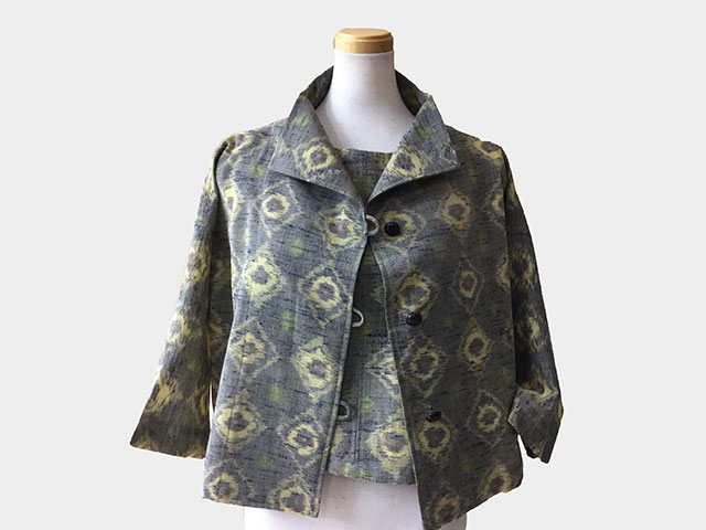 - 着物をほどいて丁寧に仕上げました。襟とボタンの大きさがポイントです。着物地なので軽く、羽織を羽織ったような感覚で着ていただけると思います。