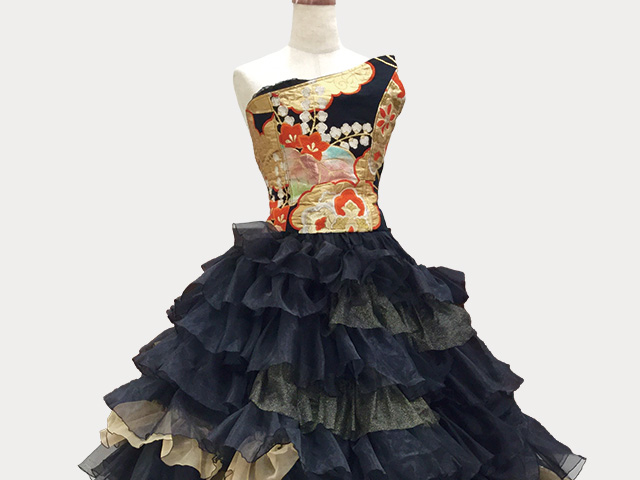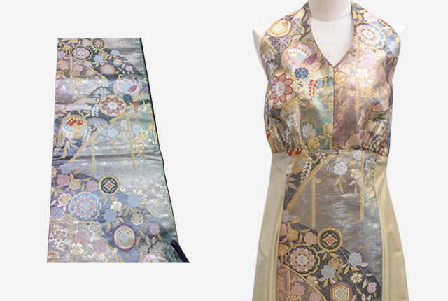 - 帯の柄・幅をそのまま活かし、脇に黒無地のサテンを入れる事でスタイルアップを意識したデザインにしています。