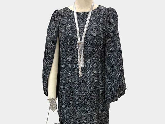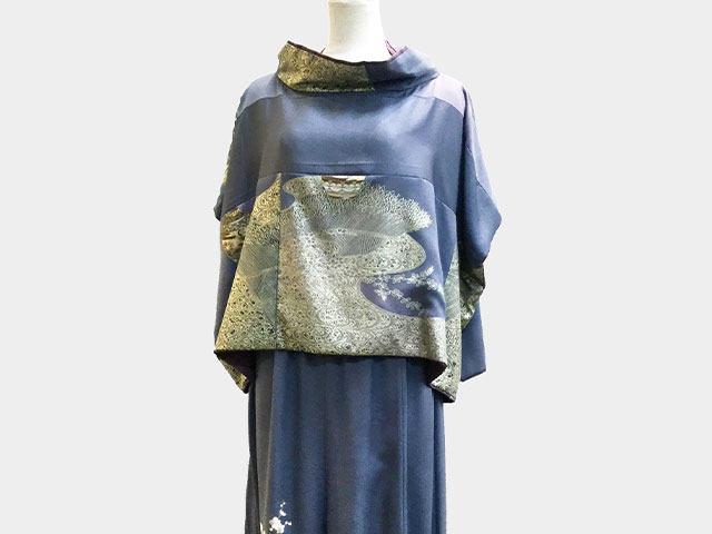 - ウールの素材の着物から、ワンピースとバッグを製作しました。後ろは膨らみを持たせて、ケープのようになっています。