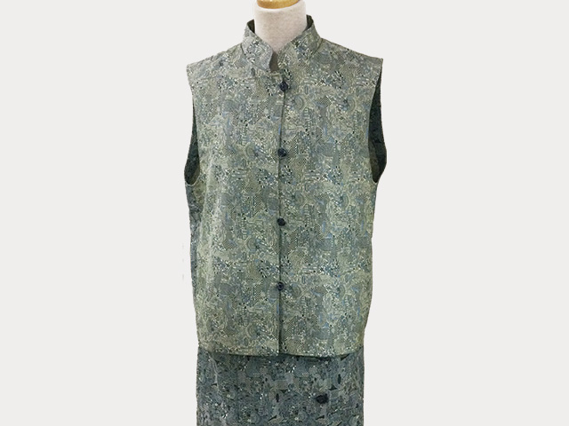 - 着物からベストとスカートを作りました。女性は歳を重ねていくとお腹まわりが気になるので巻きスカートに、ベストは首周りを考えて、スタンドカラーにしました。