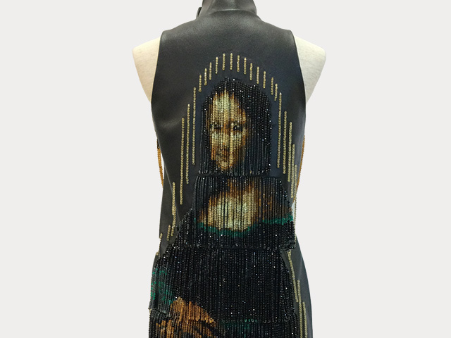 - 名画モナリザをチェコ ファイヤーポリッシュビーズで表現しました。遠目から見ると微笑んでいるのが分かりやすくなっております。刺繍ではなく吊り下げているため、動くとビーズのカットがきらめきます。