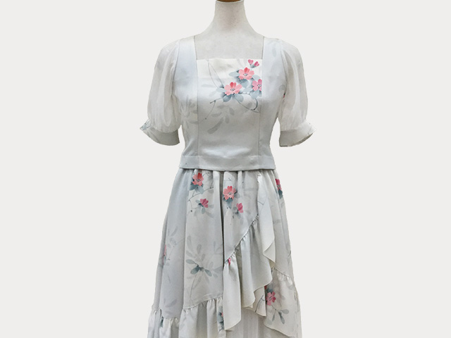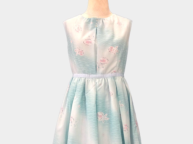 - 祖母の着物を孫のドレスへリメイクしました。着物の裾の柄を活かせるように裁断、サイドの紐を引くとデザインや長さを変更できます。ベルトは帯で作成、中に履いているスカートは長襦袢を丸々一着使っています。