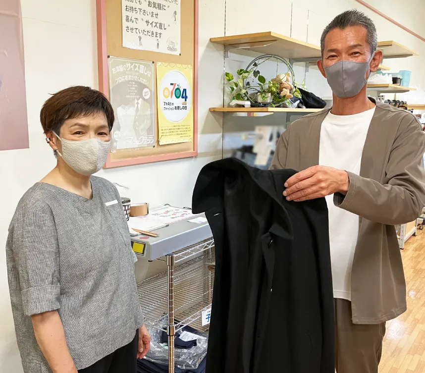 • Hさま(写真:左)と店舗スタッフ いいものなので着たいけど、このままでは着れないなと悩んでいたときに応募してみましたが、まさか当選すると思ってなかったのでとても嬉しかったです。