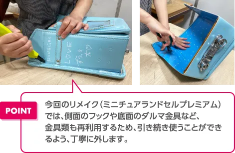 今回のリメイク(ミニチュアランドセルプレミアム)では、側面のフックや底面のダルマ金具など、金具類も再利用するため、引き続き使うことができるよう、丁寧に外します。