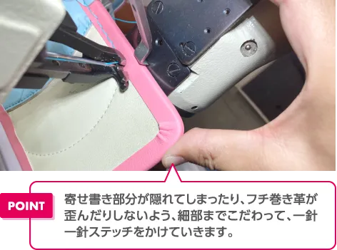 組み立て工程で接着した部分や、フチ巻き革(ピンクの部分)を縫い付けます。