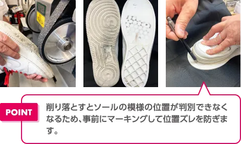 新しいソールを安定して取り付けるために、底が傷んで破れてしまったソールを削り落として、平らにします。
