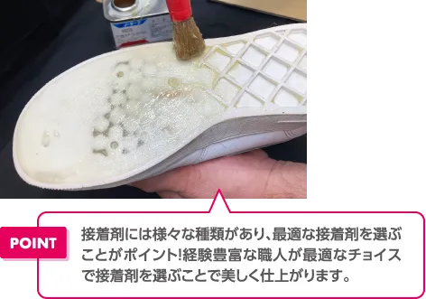 平らに削ったスニーカー本体に接着剤を塗布して新しいソールを貼り付ければ、お気に入りのスニーカーに新しい命が吹き込まれました。