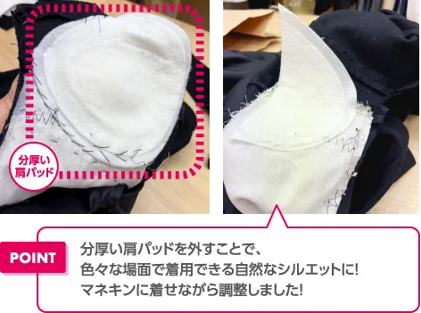 新たに薄いパッドを縫い合わせ、ふくらみを取り自然なシルエットになるよう形を整えました。