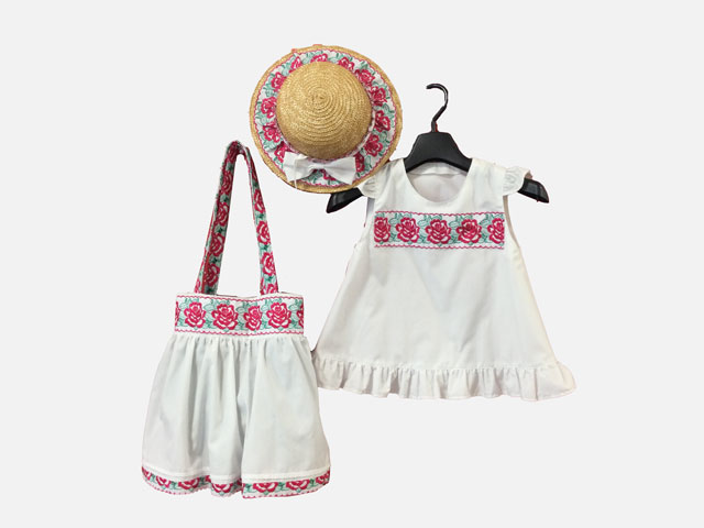 ワンピースについていたレースが素敵だったので、レースを活かしたバッグを最初に作ってみたところ、好評だったので子供用ワンピースと帽子も作ってみました。