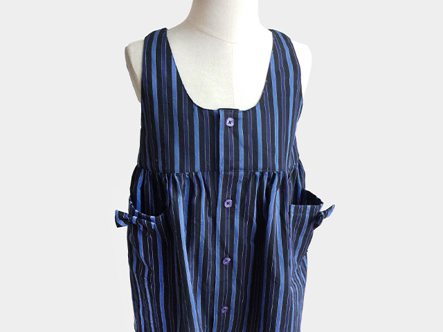 - 柄の素敵な反物を見つけたのでワンピースに仕立てました。涼しくなったら上に重ねる物で色々楽しめると思います。
