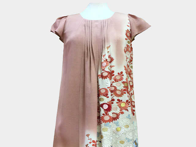 - 色鮮やかな菊柄着物をワンピースにリメイク。七五三などのママの装いにも合う上品な仕上げに。ストレッチ布で苦しくないようにし、スカート部分にもデザインを入れ、他では見た事のない着物リメイクにしました♪