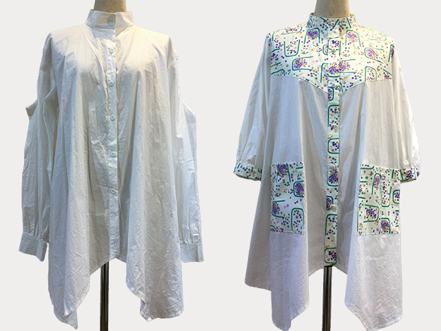 - モード系の肩あきブラウスを、可愛らしいブラウスにリメイク。ポイントは、前後に付けたV字切替と左右に付けた大きなポケットです。一枚でコーディネートが決まる、切替が特徴的なブラウスに仕立て直しました。