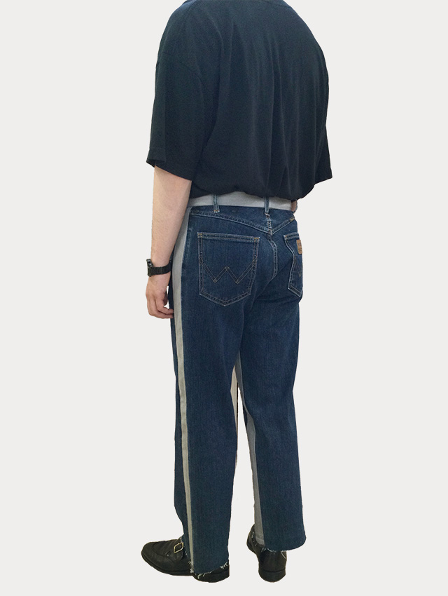 - 古着のジーンズを解体し、再構築したワイドパンツです。異なる色合いの生地を組み合わせているため、コントラストもデザインの特徴です。組み合わせる素材や幅などを自由に調整して、オリジナルの1着に。