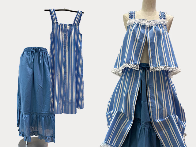- ネットで見かけたスカートを着物で再現。プリーツスカートの部分はリサイクルショップのものを使用し、ブラウスはほどいた着物の裏地を染色し製作しました。物を捨てないリユースの時代へ、いざ。