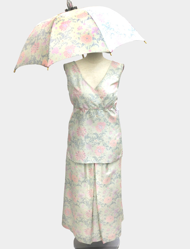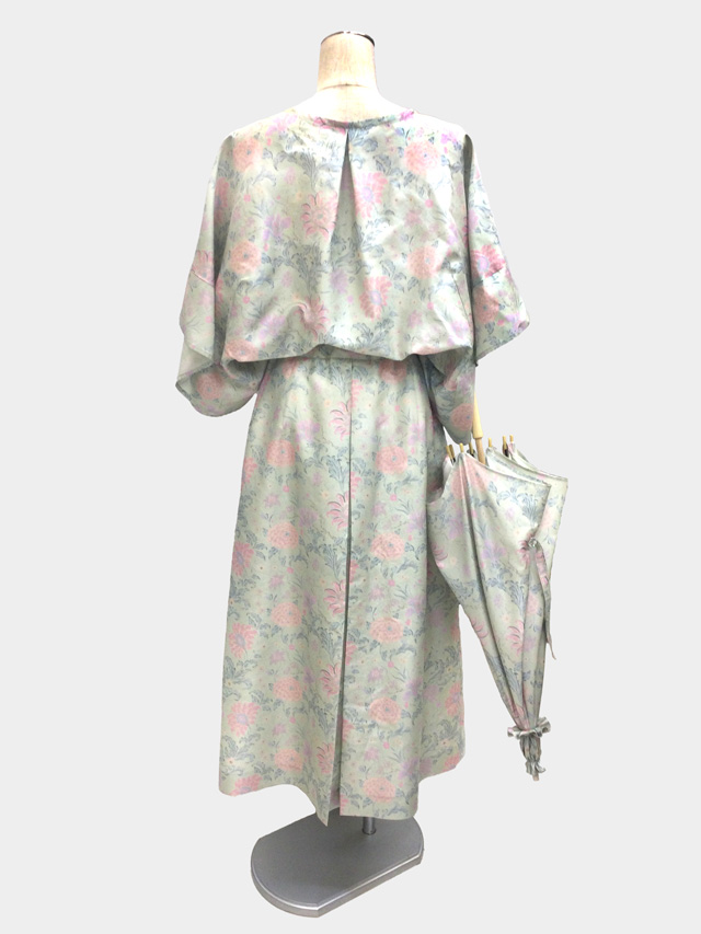 - 三川店では、普段使いの出来る着物リフォームの一着を提案します。着物地一反から洋服だけでは残布が勿体ないので、お揃いの傘、斜め掛けバッグ、エコバッグなど余すことなく製作しました。