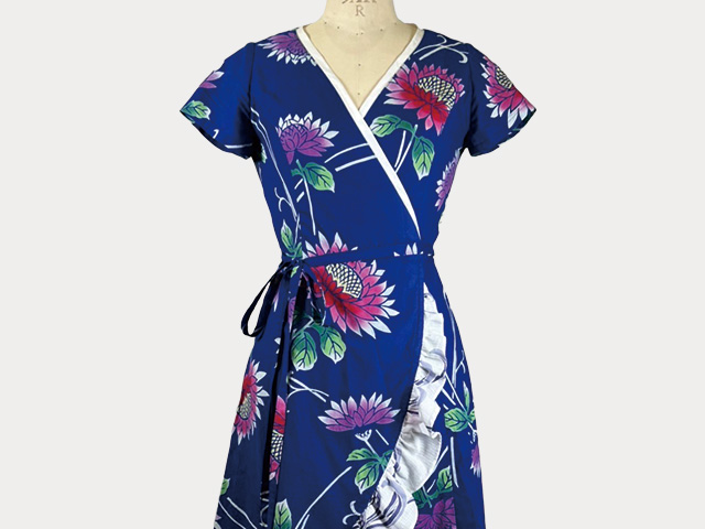 - 定番の可愛い浴衣を大正浪漫風の巻きワンピースに仕上げました。白レース部分も浴衣布で作り、胴部分には一部ストレッチ布を使用しました。締め付けが楽で体にフィットし、汗も吸収するように快適な仕上げにしてます♪