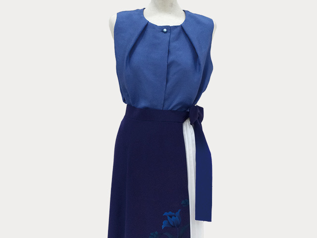 - 着物からベストとスカートを作りました。女性は歳を重ねていくとお腹まわりが気になるので巻きスカートに、ベストは首周りを考えて、スタンドカラーにしました。