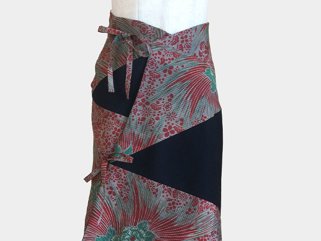 - 浴衣の生地から製作しました。長方形の布を斜めに使いイレギュラーな裾のラインに仕上げております。巻きスカートなので様々な体型の方にも着用して頂けます。