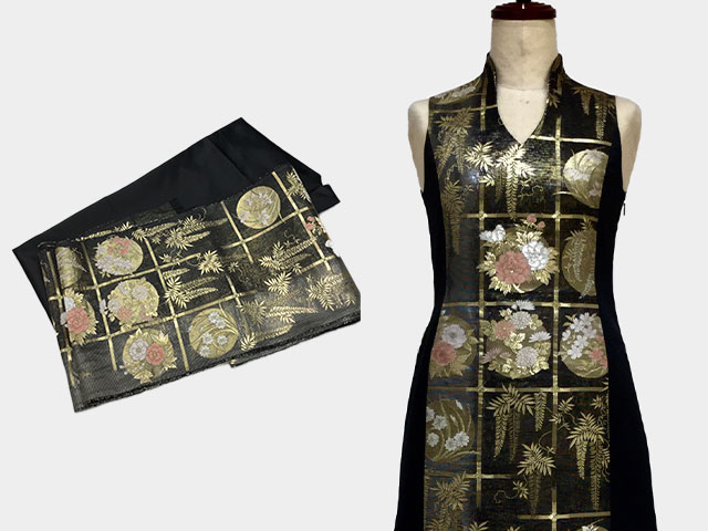 - 帯の柄・幅をそのまま活かし、脇に黒無地のサテンを入れる事でスタイルアップを意識したデザインにしています。