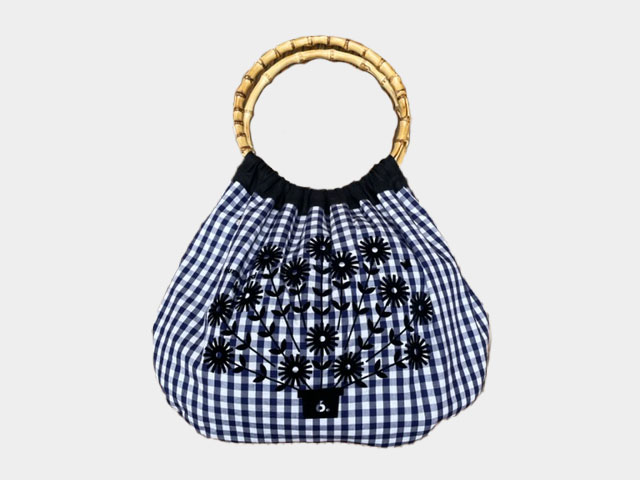 - 中央部分の柄はアイロンプリントを使用。イラストを作成してプロッターで切り抜いたモチーフをアイロン圧着しています。また、持ち手をバンプーにする事で、よりナチュラルなイメージを心掛けました。